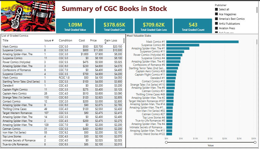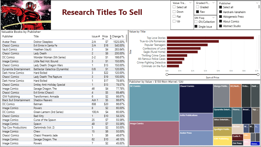 - Then I created a new dashboard with 4 sheets that analyses by graded books, compares, my collection by newly designated groups, and helps identify books that I can sell.